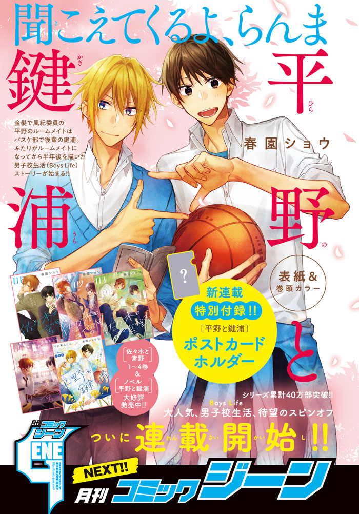 本日2月15日に発売された月刊コミックジーン3月号には、「ふたりがルームメイトになってから半年後を描いた男子校生活(Boys Life)ストーリーが始まる!!」という予告文が並ぶ。次号の付録に「平野と鍵浦」の「ポストカードホルダー」が付属することも告知された。