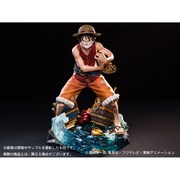 同フィギュアはアニメ「ワンピース」のDVDシリーズ「ログコレクション」のジャケットイラストを立体化する「ワンピース ログコレクション 大型スタチューシリーズ」の第1弾。重厚なマントを着用し腰に付けたサーベルに手を伸ばす「ONE PIECE Log Collection “EAST BLUE”」ジャケットのルフィが、約50cmのビッグなサイズで立体化された。なおマント部分には強力な磁石を使用しており、取り外してディスプレイすることも可能となっている。