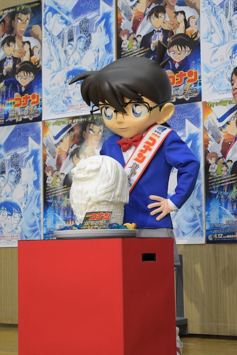 ここでイベントに同席していたコナンから、「僕の映画におふたりがゲスト出演してくださったことへのお礼に」と、劇中にも登場するマーライオンをイメージしたケーキが贈られる。「劇中では僕はおふたりと敵対する関係なんですけど、おふたりのアフレコがとってもカッコよかったので、プレゼントです!」と元気に語るコナンに対し、2人は「ありがとうございます!」とお礼しながらも「これマーライオンですか?」「マーライオンって(口から水が)吹き出てるのが印象的なので……」「マーライオンというよりシーサーですね」と正直な感想を口にし、現場の笑いを誘う。さらにコナンは青山から預かってきたと、それぞれのキャラクターが描き下ろされた色紙を2人に進呈。これには2人とも「すごい……!」「うれしいです……! ありがとうございます!」と感激した様子で、山崎は「マーライオンよりもうれしいです」とここでも素直な感想を述べた。