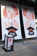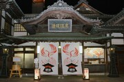 道後温泉本館が営業をしながら、保存修理工事に入ることに合わせて立ち上がった「道後REBORNプロジェクト」。本館西面には「火の鳥」デザインの日除け幕と灯籠が設置されている。また保存修理工事期間限定で、入浴券も「火の鳥」とコラボレート。なお手塚プロダクション制作によるオリジナルアニメとして大国主(オオクニヌシ)役で