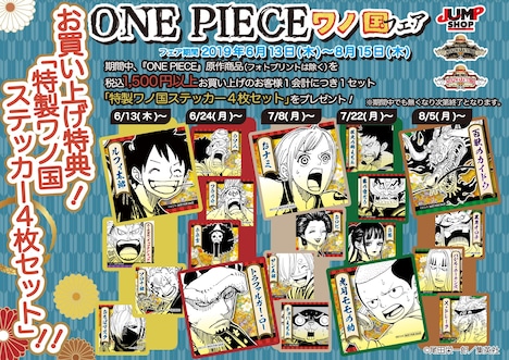 期間中に店舗で「ONE PIECE」の原作イラストを使用した商品を税込1500円以上購入した人に、「特製ワノ国ステッカー」4枚セットを1会計につき1枚プレゼント。ステッカーは第5弾まで用意される。なお東京・MAGNET by SHIBUYA109に、6月13日にオープンする麦わらストア渋谷本店では、第1弾のステッカーにホログラム加工を施した状態で購入特典として配布を行う。