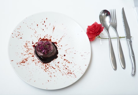 「喰種レストラン」は4万本の薔薇に包まれた空間で、血をテーマに調理された“禁断の美食”を楽しめる体験型レストラン。映画本編にも登場する、喰種が集う秘密のレストラン「喰種レストラン」を表現した空間で提供される「血と薔薇の美食ディナーコース」は、フレンチレストラン・エールの山本英男シェフが手がけており、フォアグラやシャラン鴨などの高級食材をふんだんに使って「東京喰種」の世界観を表現している。