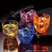 「ONE PIECE」モデルの江戸切子はルフィ、シャンクス、エース、ローをイメージした4種類をラインナップ。ルフィモデルの「紺碧の航路」には、ブルーの色被せガラスにくり返す波文様が、シャンクスモデルの「紅の傷跡」には、赤髪にちなんだレッドのガラスに、シャンクスの傷跡をイメージしたいくつもの線が荒々しく交差する模様がデザインされた。