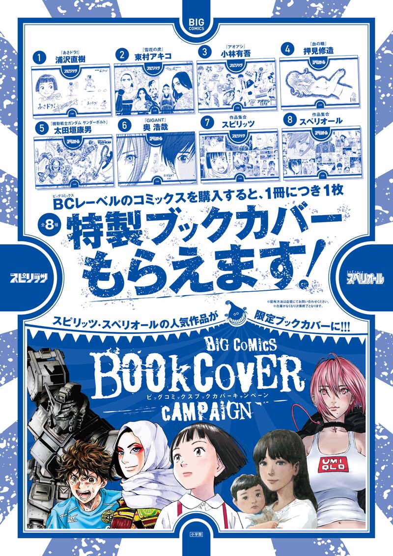 同キャンペーンではビッグコミックスの単行本を購入すると、1冊につき1枚、週刊ビッグコミックスピリッツおよびビッグコミックスペリオール(どちらも小学館)の連載作をモチーフにしたブックカバーをプレゼント。デザインは