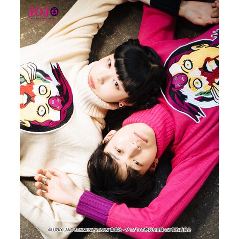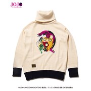 プロシュートのスタンドであるザ・グレイトフル・デッドが噴出するガスを、ボーダー状のデザインに模してあしらった「コラボレーションシャツ2」は、無数の目と「Prosciutto」の文字をコラージュ。カエルを電話代わりに語りだすドッピオの姿を刺繍した「コラボレーションニット」は、インパクト抜群のアイテムに仕上げられた。