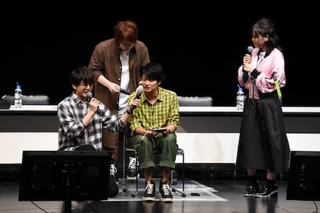 3つ目の指令は「錬磨で高得点を目指セ!」。これは「鬼滅の刃」のBlu-ray / DVD第3巻に特典として付属するオリジナルの横スクロールゲーム「鬼滅の錬磨」に4人が挑戦するというもの。炭治郎、善逸、伊之助からプレイするキャラクターを選ぶことができ、それぞれ異なるスキルを用いることができる本格的な仕様だ。スマートフォンを持ってプレイするため両手がふさがる下野に花江がマイクを差し出し、松岡が水を飲ませられるようスタンバイ。下野、松岡、花江がそれぞれ自分のキャラを選んでプレイしたあと、鬼頭が誰を選ぶのかに花江と下野は注目する。すると鬼頭が選んだのは伊之助。鬼頭が「一番使いやすそうだったから」と理由を述べると、2人は「まあそういう理由ならいいよ!」と口を揃えた。