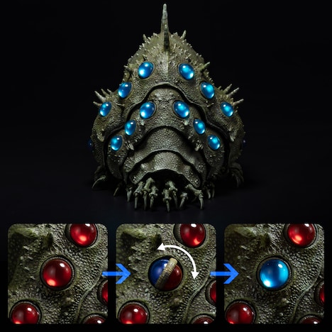 スタジオジブリ全面監修のもと、造形作家・竹谷隆之が中心となって立体化した「タケヤ式自在置物 風の谷のナウシカ 王蟲」。生命感に溢れた造形もさることながら、関節や身体の動きまでもがリアルに作り込まれており、たとえば外殻部分は、内部に仕込まれた可動ジョイントによりそれぞれがスライドするため、全身をひねりながら動く姿を再現することができる。頭部のアゴ、100本におよぶ脚も可動。透明パーツで再現された14個の眼には、攻撃色の“真紅”と穏やかな“碧色”を切り替えられるギミックが搭載された。
