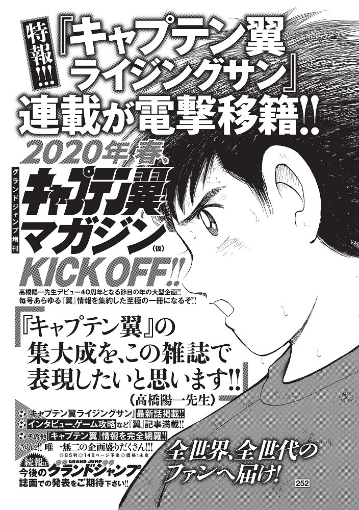 キャプテン翼マガジンには「キャプテン翼 ライジングサン」の最新話に加え、「キャプテン翼」にまつわるインタビューや、同作を題材にしたゲームの攻略情報などを掲載。本日11月20日発売のグランドジャンプ24号に収録された「キャプテン翼 ライジングサン」102話の最終ページの見開きには高橋からのメッセージが掲載されており、キャプテン翼マガジンの告知ページでは高橋が「『キャプテン翼』の集大成を、この雑誌で表現したいと思います!!」と語っている。