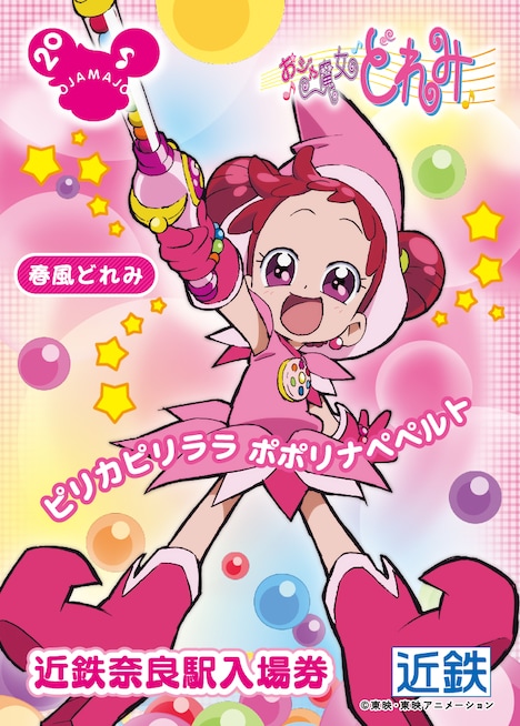 また「おジャ魔女どれみ」のキャラクターをデザインした特製入場券の発売も決定。京都駅でははづき、大和西大寺駅ではおんぷ、近鉄奈良駅ではどれみ、大和八木駅ではあいこ、橿原神宮前駅ではももこの絵柄の入場券が、4月24日から6月30日まで販売される。5種類の特製入場券をすべて集めると、コラボビジュアルを使用したカードを贈呈。特製入場券を扱う5駅には、各キャラクターの等身大パネルも設置される。