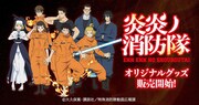 ラインナップされたのは、炎のマスコット「メラメラ」「プスプス」を配置したグラスとポーチ、アニメの印象的な場面を大きく配置したクリアファイル、アクリルプレート、Tシャツ。「メラメラ」「プスプス」モチーフのグラスとポーチは、ステンドグラスをイメージしたデザインに。またクリアファイル・アクリルプレートには、主人公・シンラを始めとした第7・第8特殊消防隊メンバーの名場面があしらわれ、Tシャツ5種にはアニメの世界観が表現された。