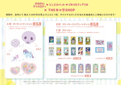 期間中、税込3000円購入するごとに、抽選会に1回参加が可能。A賞にダイカットクッション、B賞にステッカーコンプリートセット、C賞にステッカーが用意されている。