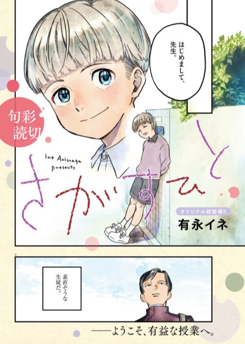 「さがすひと」は非現実的なものを嫌う生真面目な家庭教師と、彼の教え子である優秀な少年を軸とした物語。ファンタジーの本を読み聞かせしてほしいと少年にねだられた家庭教師は、「ファンタジーは“嘘”が書いてある」ということを理由に一度は断るが……。ビッグコミックオリジナルに初登場となる有永が、人々の心の交流を描いていく。