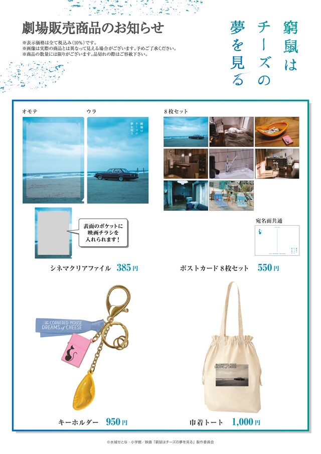 販売されるグッズは全部で4種類。クリアファイルと巾着トートには、恭一と今ヶ瀬が劇中で訪れる夜明けの海岸がプリントされた。クリアファイルの表面には映画のチラシを収納できるポケットも付いている。また海岸のカットに加え、恭一の部屋のベッドや、 2つ並んだ歯ブラシ、今ヶ瀬が恭一にもらって大事にしているジッポーライターと灰皿のセットなど、2人の同棲生活の様子が垣間見える写真を使用したポストカードセットも登場。さらにジッポーライターと灰皿を模したキーホルダーも用意された。