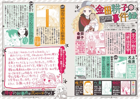 「名探偵 耕子は憂鬱」は空前のミステリーブームに沸く昭和中期を舞台に、18歳の探偵見習い・耕子が難事件に挑む様子を描く物語。全国に素人探偵が急増したため、国は3つの難事件を解決した者にのみ、探偵の免状を与えるという新法を作った。耕子は難事件を無事解決し、探偵になれるのか。同作は花とゆめ3号に掲載された読み切りが人気を博し、連載化したもの。巻頭ページで鈴木は「尊敬する横溝先生の金田一シリーズに対する私の愛の形」とコメントを発表し、横溝正史の「金田一耕助」シリーズへのリスペクトを語った。「神様はじめました」「忍恋」の鈴木が描く新作に注目したい。