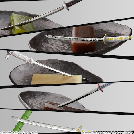 菓子切として用意されたのは、炭治郎、善逸、伊之助、義勇の日輪刀4種類で、全長約140mmの金属製。刀身は金属加工で有名な新潟県燕市で製造されており、職人が1本ずつ専用の型で仕上げられている。炭治郎の刀身には黒光りが映える特殊な加工を使用しており、善逸や伊之助の刀の特徴、義勇の刀に刻まれた“悪鬼滅殺”の文字なども忠実に再現された。羊羹は個箱入りの食べ切りサイズで、炭治郎の抹茶味、禰豆子の梅味、善逸の栗味、伊之助の白煉味、義勇の小倉味の5種類がセットになっている。