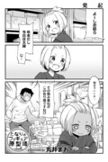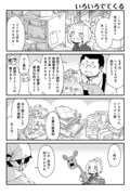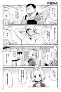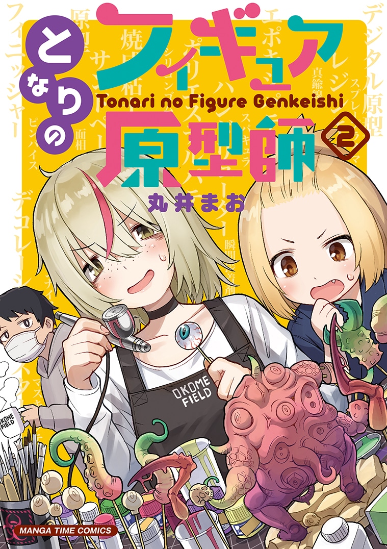 「となりのフィギュア原型師」は、個人で活動していたフィギュア原型師・半藤隆太郎が、憧れの原型師・滝館おこめが代表を務める工房のメンバーになったことから始まるワイド4コマ。子供のような見た目だが腕はすごい代表をはじめ、気弱だがマッチョやクリーチャーが好きでピアスだらけの女性原型師、美少女好きの巨漢といった個性豊かなメンバーに混じって、人見知りの半藤がフィギュア作りに励む。まんがタイムオリジナル(芳文社)で連載中。2巻冒頭では仕事道具もいらないものも溢れかえる工房の大掃除が行われるも、片付けが苦手な代表の手伝いをする半藤がレアな滝館おこめ作品に夢中になってしまい、ミイラ取りがミイラになる様子などが描かれる。