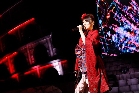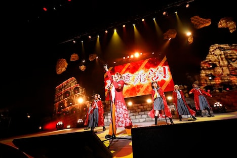 宮野真守演じる巽幸太郎の激しいアナウンスにより、ファンの期待感がピークへと高まった瞬間、会場に衣川の妖艶な歌声が響く。幕開けを飾ったのはライブ初歌唱となる「佐賀事変」。アニメMVを再現し、衣川は和洋折衷のロングドレス、ほかのメンバーは書生風のレトロな衣装で登場した。歌い終えた一同は「お待たせしましたー!」「元気だったー?」と口々に呼びかけ、配信で観ているカメラの向こうのファンへも手を振った。賑やかに自己紹介やトークを展開する中、自然な流れでさくらとサキのラップバトルが始まり「DEAD or RAP!!!」へ。曲と曲の合間にはライブのレッスン風景とともに、メンバーが今日のライブへの思いを語るインタビュー映像も届けられた。