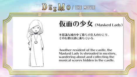これは現在オンラインで開催されている「AnimeJapan 2021」内の「DEEMO THE MOVIE」のステージで発表されたもの。仮面の少女は不思議な城の中で暮らす住人の1人で、その行動は謎に満ちている。このほか映画の特報映像も公開された。