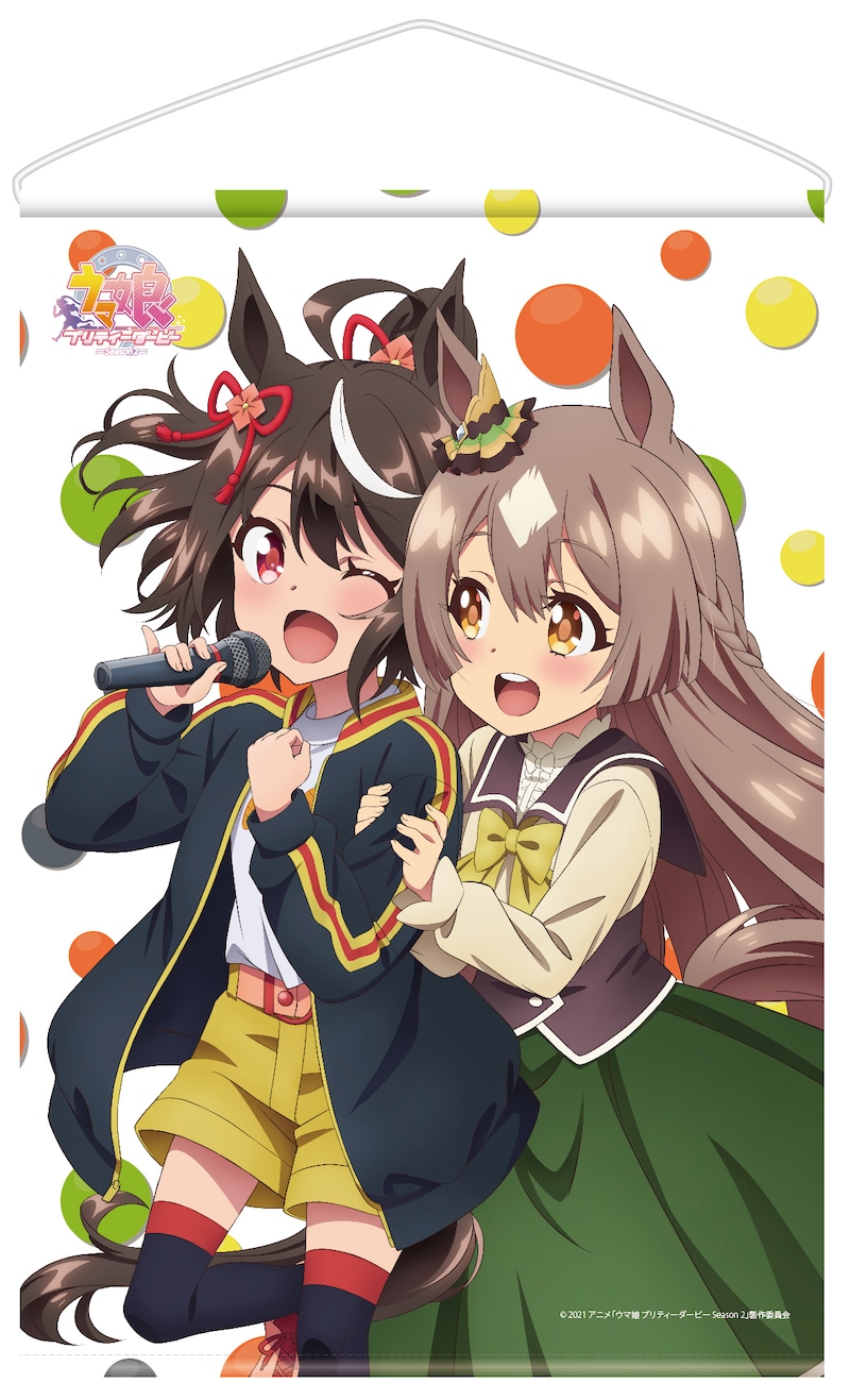 ラインナップされたのは、B2タペストリー、スポーツタオル、クリアファイル、ラバープレイマットの4商品。各アイテムにはマイクを手にしたキタサンブラックと、仲よさそうに腕を絡めるサトノダイヤモンドのイラストが使用されている。商品の予約はキャラアニ.comをはじめ、各ECサイト、全国のキャラクターグッズショップで受付中。購入者にはB2タペストリー、スポーツタオル、クリアファイルが9月、ラバープレイマットが10月に届けられる。