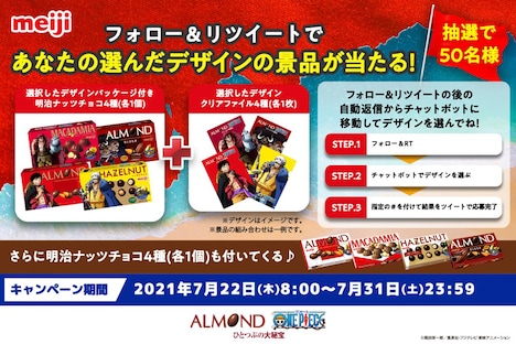 本日7月22日が原作の連載が開始された“ワンピースの日”であることと、“ナッツの日”であることにちなんで行われるこのキャンペーン。参加者の中から抽選で50人に、各自が選んだデザインのオリジナルパッケージに入ったナッツチョコや、クリアファイルなどの景品セットがプレゼントされる。オリジナルパッケージやクリアファイルにはルフィ、ロー、キッド、カイドウのイラストが使われた。参加したい人は明治ナッツチョコシリーズの公式Twitter(@meiji_nutschoco)をフォローのうえ、キャンペーンツイートに記載の手順に従って応募しよう。
