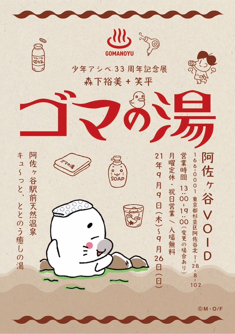 「少年アシベ33周年記念展『ゴマの湯』」は、1988年に連載開始された「少年アシベ」の作者・森下と、2017年に公式スピンオフ作品としてスタートした「青少年アシベ」の作者・笑平による2人展。銭湯をテーマにした新作ドローイング作品の展示・販売ほか、タオルや手ぬぐいなどお風呂グッズの販売も行う予定だ。通販も計画されているため、詳細はVOIDの公式サイトやSNSなどで確認を。