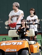 「ソードアート・オンライン」と読売ジャイアンツのコラボにより、始球式のほか当日の場内アナウンスを担当した松岡たち。始球式では3人がキリト、エギル、リーファといったキャラクター名と、「劇場版 ソードアート・オンライン -プログレッシブ- 星なき夜のアリア」の公開日である「1030」の数字が入った特注ユニフォームをまとって参加した。