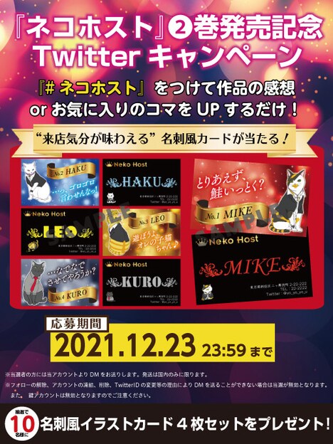 上記2作品の発売を記念したキャンペーンも展開中。「ネコホスト」の公式Twitterアカウントをフォローし、ハッシュタグ「#ネコホスト」とともに作品の感想をつぶやくと、抽選で10人に名刺風イラストカード4枚セットがプレゼントされる。応募期間は12月23日23時59分まで。また「ネコホスト」と「ネコ先輩さすがです!」の1巻が格安で読める施策も実施されており、コミックシーモア、dブック、ebookjapanでは12月22日までストリーミング無料、kindleでは2022年1月10日まで22円で読むことができる。