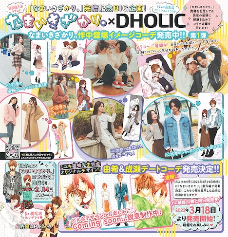さらに「なまいきざかり。」とファッションブランド・DHOLICとのコラボが決定。作中に登場するファッションを、DHOLICのアイテムで再現したコーデ全7種が、DHOLICのオンラインショップで販売されている。花とゆめ8号に掲載される番外編では、DHOLICのアパレルアイテムを着用した由希と成瀬が登場。3月18日に番外編での着用アイテムが発売される。このほか「なまいきざかり。」の完結を記念し、TikTok企画が進行中。2月14日にスタートする。