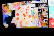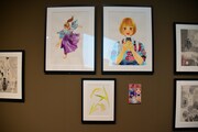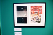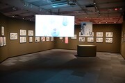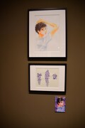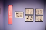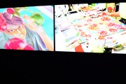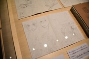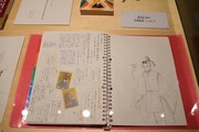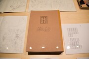 まず会場の入り口には「ちはやふる」の印象的なシーンを映した巨大スクリーンが登場。スクリーンの両脇は障子に囲まれており、そこに桜の花びらが舞っているかのように見えるデザインとなっている。第1章「かるたがあるからまた会える~物語の始まり~」では、第1話のすべてと追加エピソードの原画を展示。クイーン戦を予感させるシーンから始まり、千早、太一、新の運命を大きく変えた出会いと別れを辿ることができる。資料展示のコーナーには末次のネームノートも。末次は第174話以降、ネームもデジタルで制作するようになったため、このネームノートは紙に描かれたストーリー構成を見られる貴重な資料だ。さらに百首各々について末次自身が調べ、文字とイラストでまとめたノートも展示された。