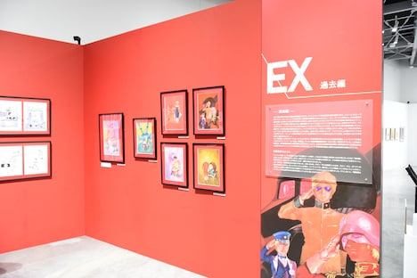 アムロがガンダムに乗り込むまでを、よりドラマチックに描いた「始動編」、シャアとアムロが初対決を果たす「激闘編」を皮切りに、各エリアには繊細な筆使いを感じるアナログ作画の美麗なイラストや原画が、額縁に入れられ途切れることなく続く。単行本6巻分にわたって描かれた「過去編」のエリアは、シャアのパーソナルカラーである赤色の壁に。シャアの父であるジオン・ズム・ダイクンをはじめ家族が揃ったイラストには、ジオン・ズム・ダイクンへの安彦の思いを綴った文章が添えられた。