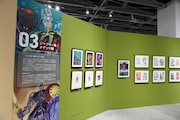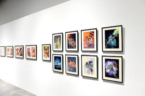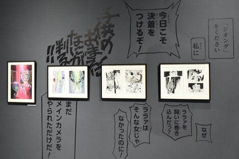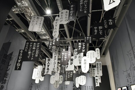 一層こだわり抜かれたのは、物語のラストを飾る「ひかる宇宙編 / めぐりあい宇宙編」の展示エリア。作中に登場した印象的なセリフがフキダシの形で天井から吊るされ、原画を展示する壁にも描かれた数々のセリフが目を引く。ララァの最期、アムロとシャアの激闘、“ラストシューティング”と名場面も続き、原画からは執筆時の勢いさえ感じられた。「ひかる宇宙編 / めぐりあい宇宙編」は展示エリアの中でも大きなスペースを割いており、静かに流れる名曲とともに物語の終わりまでをじっくりと堪能できる。