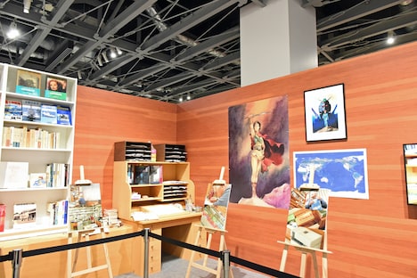 「THE ORIGIN」の展示の先には、仕事机から本棚まで安彦の仕事場を再現したコーナーが登場。安彦が1970年代に移り住んで以来住み続けている所沢市について、街の変化や武蔵野うどんなど、プライベートを語るインタビュー映像も視聴できる。このエリアでは安彦が監督を務める劇場アニメ「機動戦士ガンダム ククルス・ドアンの島」の初お披露目となるイラストも展示。地球連邦軍の一員になりきれるフォトスポットや、充実の物販など展示以外も楽しんでほしい。
