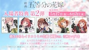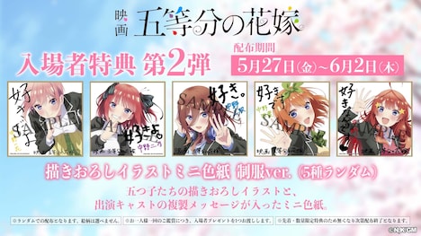 また5月27日から6月2日まで配布される入場者特典第2弾も発表に。五つ子たちの描き下ろしイラストと出演キャストの複製メッセージが入った「ミニ色紙 制服ver.」で、5種類がランダムで配布される。さらに第1弾の入場者特典「『五等分の花嫁』14.5巻」の再配布も決定した。配布開始は6月17日を予定している。