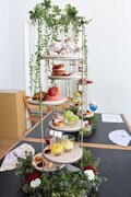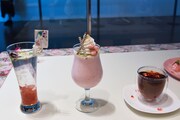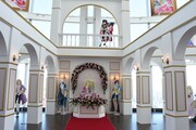 エントランスに足を踏み入れると、ベルサイユ宮殿をイメージした優雅な回廊が来場者たちを圧巻させる。中央にはマリー・アントワネット、オスカル、フェルゼン、アンドレのパネルが設置され、4人の周りにピンクや赤、白の美しい花々が添えられた。2階には黒い騎士ことベルナール・シャトレが姿を現し、壁面にはそのほかの登場人物たちが肖像画のように飾られている。