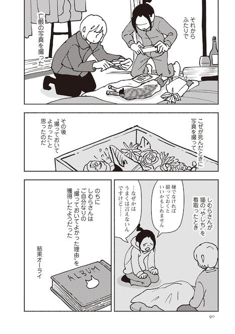 「ポッケの旅支度」の作中にも描かれているが、イシデには前の飼い猫・こぜの看取りに対する大きな後悔があった。話題がそのことにおよぶと、イシデは「ちゃんと介護できていなかった。医療費を稼ぐことが飼い主の責任で、それが介護だみたいな感じになっちゃっていた」「あんまり一緒にいられなかったんですよね」と思いを馳せる。読者の反応には、同じように飼い猫の看取りに後悔を残しているものも多かったそう。イシデは「やり直しがきかないですからね。自分のやったことが最適解だったのかっていう証明はできないわけじゃないですか。だから後悔がある人もたくさんいるとは思います」と理解を示す。こぜとは違う最期をポッケに選んだイシデだが、ポッケの看取りはこぜのときとは違ったかという問いには、年齢を重ねて猫に限らず“不幸”を経験してきたぶん、「こればっかりはしょうがないと思えるようになったんじゃないか」と述懐。「後悔しようと思えばいくらでもできると思いますけど、それで帰ってくるわけじゃないからしない」と言い切る。一方で、今回お世話になった動物病院が“深追い”をしない方針だったことが救いだったのかもしれないと振り返り、「もし違うところで、(延命のために)ああしたらこうしたらと言われていたら乗っちゃってたかも」とも話した。