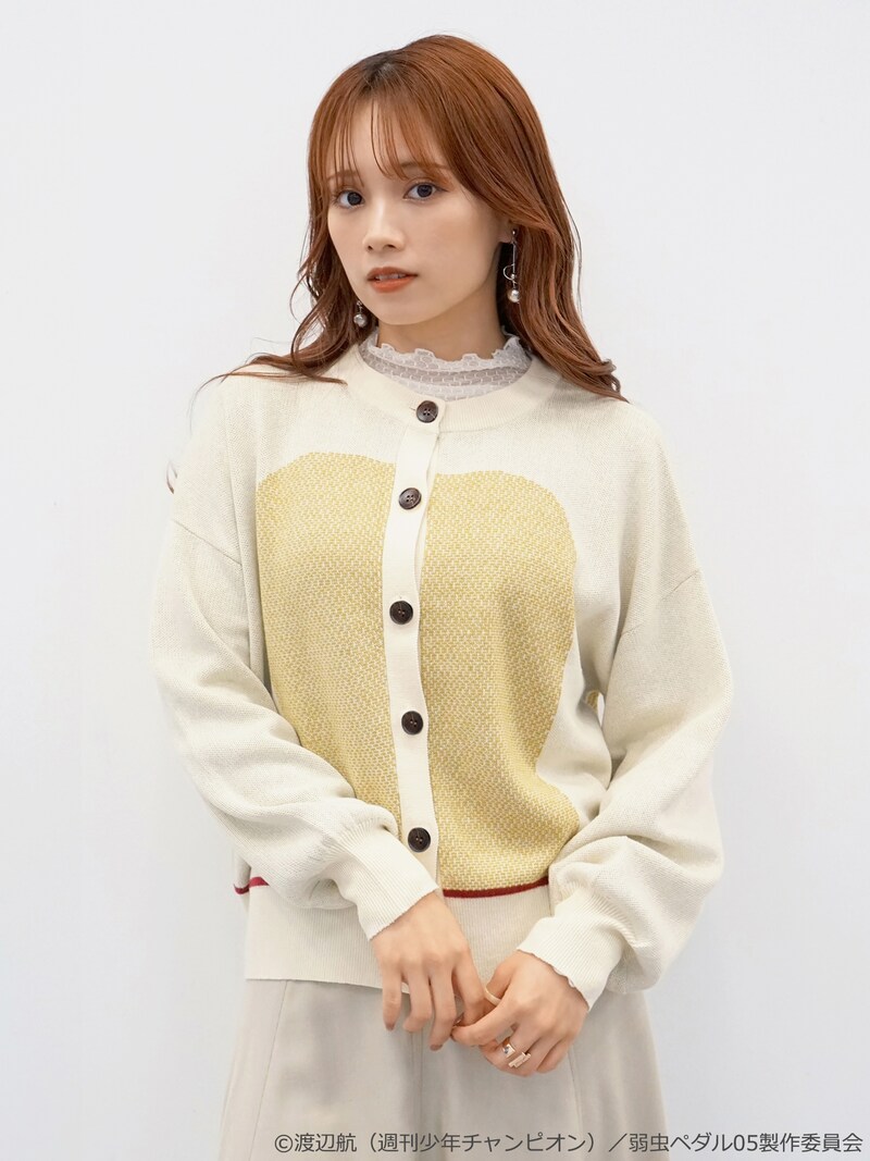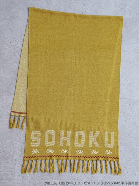 今回ラインナップされたのは総北高校と箱根学園をイメージしたニットアイテム3種類。サイクルジャージをオマージュしたニットカーディガンは、配色柄部分に2色の糸を組み合わせたジャガード編みを施すことで風合いのあるカラーに仕上がった。ニットプルオーバーの左袖にはロードバイクと学校名をあしらったオリジナルロゴを刺繍。オリジナルロゴのジャガード編みが施されたニットストールは首に巻くだけでなくひざ掛けとしても使うことができる。各アイテムは総北高校をイメージしたイエローと箱根学園をイメージしたブルーの2色展開。