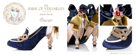 一方、オスカルのパンプスはバラの模様があしらわれた深いネイビーのベルベット生地を使用し、フランス衛兵隊の軍服に身を包むオスカルの姿を表現。異素材を重ね合わせた艶めくリボンと、軍服の飾緒をイメージした流れる金の装飾が施されている。リボン中央には、衛兵隊時代にオスカルの首元で輝いていたブローチがあしらわれた。
