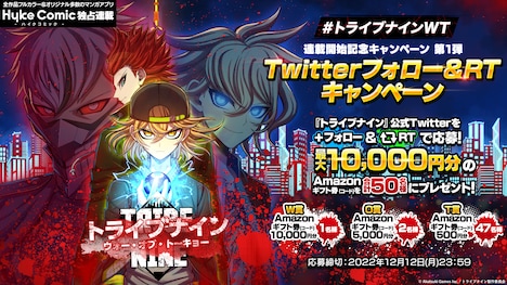連載開始を記念し、「トライブナイン」公式Twitterでは、抽選で50人に最大1万円分のAmazonギフト券をプレゼントするフォロー&リツイートキャンペーンを実施中。応募は12月12日23時59分まで受け付ける。なお12月13日には「トライブナイン/ウォー・オブ・トーキョー」のおすすめ話数をTwitterでシェアすることで、オリジナルデザインのAmazonギフト券を抽選で30人にプレゼントするキャンペーンがスタート。詳細は「トライブナイン」公式Twitterで確認しよう。