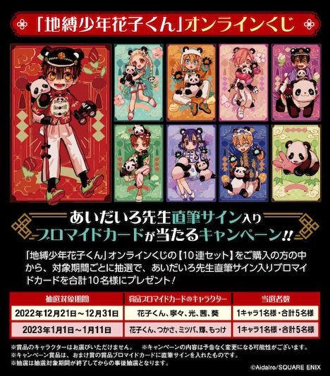くじの景品はS賞からD賞まで用意されており、S賞にアクリルボード、A賞にトートバッグ、B賞にアクリルスタンド、C賞にミニ色紙、D賞に缶バッジをラインナップ。アイテムにはパンダの耳をつけた花子くんたちのチャイナテイストなイラストがデザインされた。なおイラストはあいだいろ描き下ろしとなる。