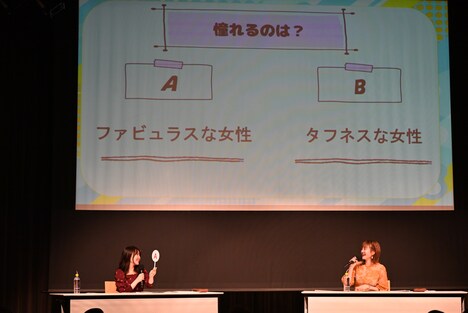 イベント内では麻倉と久保がお互いへの理解度を試す「パートナーとの絆診断」、「アルマギア」本編のコマを使い、観客からの面白い回答を紹介する大喜利企画「漫画で大喜利」といったコーナーも実施。2択のお題から麻倉と久保が選びそうな選択肢を観客が予想し、2人への理解度を図る「私は、どっちでSHOW!」では、まず麻倉に関して「ファビュラスな女性とタフネスな女性、どちらに憧れる?」というお題が出される。観客の予想は「タフネスな女性」に集まるも、麻倉は「もともと『ファビュラスな女性になりたい!』という憧れはないんですけど、最近叶姉妹さんの配信番組を見て、私の中でぐんと存在感が高まっているということもあって(ファビュラスな女性を)選ばせていただきました」と答えた。久保に関するお題は「異世界に転生したら、チート主人公として暮らすか、平凡なモブとして暮らすか」というもの。久保が「どっちも嫌だけど……」とこぼす中、観客の予想は「平凡なモブ」に多く寄せられた。観客の回答を見て、久保は「嫌だけど、チート主人公かな……。そもそも異世界に転生したくないな……。そこでモブなんてさらにつらいし、夢見たくない? あとチート主人公なら死ぬことはないだろうし、もし死んじゃうとしても輝いてから死にたい」と意図を説明する。