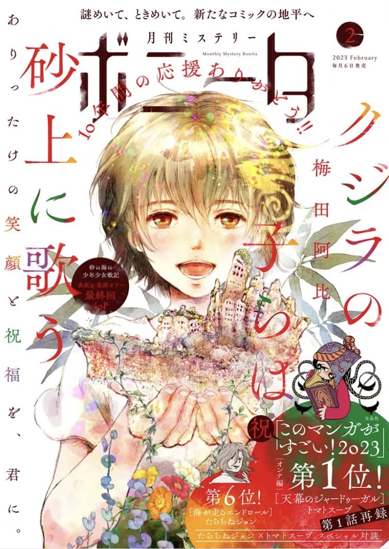 仝 / ナタリー - 梅田阿比「クジラの子らは砂上に歌う」が、本日1月6日発売の月刊ミステリーボニータ2月号(秋田書店)で最終回を迎えた。「クジラの子らは砂上に歌う」完結!付録に画集、たらちねジョン×トマトスープ対談も https://t.co/tsb99vhC06 https://t.co/JNQ8kCwUea