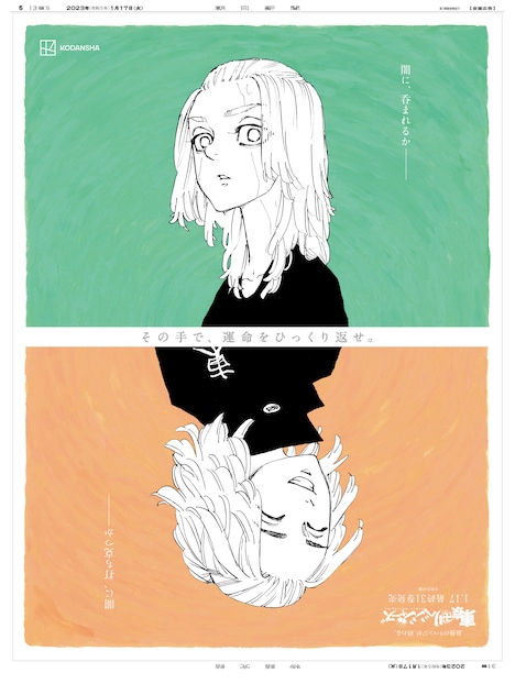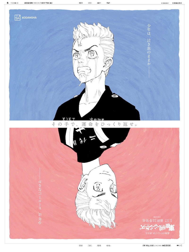 広告は新聞をひっくり返すとキャラクターの運命も“ひっくり返せる”という仕組み。全7パターンが用意され、花垣武道、橘日向、佐野万次郎、龍宮寺堅、松野千冬、三ツ谷隆、佐野真一郎が地域別の1面に登場する。