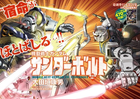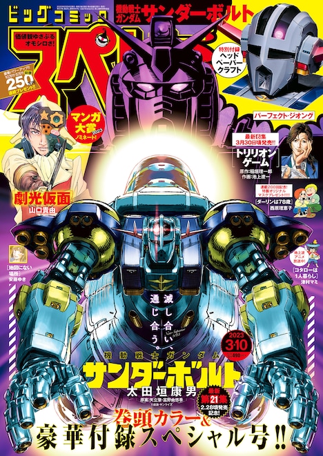 付録として用意されたのは、作中に登場するパーフェクト・ジオングの頭部のペーパークラフト。パーフェクト・ジオングはイオ・フレミングが宿命のライバルであるダリル・ローレンツが搭乗するパーフェクト・ガンダムに対抗するため、ニュータイプのリリーとともに搭乗する機体だ。なお今号には本編の第182話を掲載。死闘を繰り広げるイオとダリルだが、戦況は思わぬ方向へと展開し……。また「機動戦士ガンダム サンダーボルト」の単行本最新21巻は2月28日に発売される。