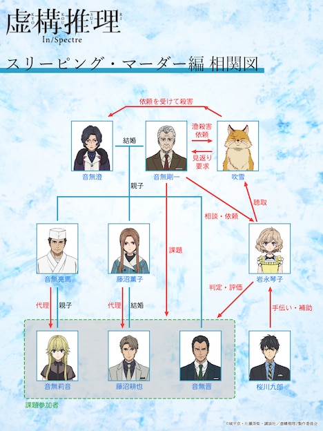 この発表に併せ、「スリーピング・マーダー編」の相関図、3月5日に放送される第9話「#21 もの言えぬ子ども達」のあらすじ、場面カットも公開に。さらに「虚構推理 Season2」Blu-ray第1巻の全巻共通特典として用意されたブックレットの表紙、同特典に収録される片瀬の描き下ろしマンガの試し読みも到着した。