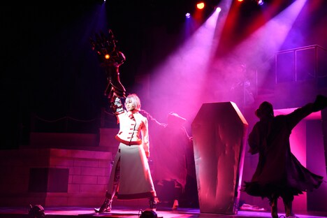 舞台は、飛空船内で起きたとある事件を通じて、ヴァニタスとノエが出会う場面からスタート。アニメ1期のオープニングテーマ「空と虚」に乗せて登場人物たちが華やかなダンスを披露する場面も観られた。またヴァニタスが“ヴァニタスの書”を用いる治療シーンや、吸血鬼たちの攻撃シーンはプロジェクションマッピングで迫力が演出され、謎に包まれた黒い影・ネーニアは複数のダンサーによる妖艶な踊りで表現された。