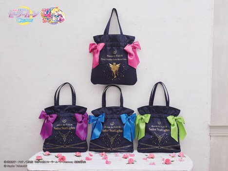 Maison de FLEURのイメージでもあるリボンやビジューを用い、各セーラー戦士のイメージカラーを再現したアイテムをラインナップ。Maison de FLEURの定番アイテムであるダブルリボントートバッグやベアチャーム、がま口形状のリボンポーチ、リボンバレッタ、リボンチャームなど全39種が揃えられた。