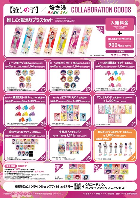描き下ろしイラストを用いた銭湯鍵風のキーホルダーや、牛乳瓶入りキャンディなどオリジナルグッズも登場。1会計で2000円購入するごとにホロカードがランダムで1枚と、館内タペストリーなどのコラボ装飾が当たる抽選券が1枚付属する。なおホロカードのラインナップは期間により異なる。