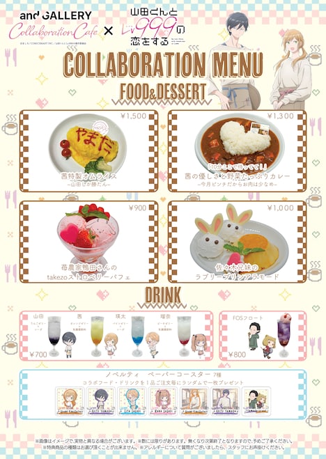 コラボカフェでは、カフェの制服に身を包んだキャラクターたちの、マッドハウス描き下ろしの等身大イラストと、デフォルメイラストが空間を演出。茜が作る料理をイメージした「茜特製オムライス~山田しか勝たん~」「『10分ここで待ってて!』茜の優しさと野菜たっぷりカレー~今月ピンチだからお肉は少なめ~」や、「苺農家鴨田さんのtakezoストロベリーパフェ」「佐々木兄弟のラブリープリンアラモード」などのフードが提供される。また山田たちをモチーフにしたドリンクも用意。コラボフードおよびドリンクを1品注文ごとに、特典としてペーパーコースター7種の中から1枚がランダムにプレゼントされる。さらに各店舗では来場者特典として、トレーディングカード全8種の中から1枚がランダムに配られる。