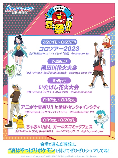 また「ポケットモンスター」は「夏はやっぱりポケモン!アニポケ夏祭り!!」と題し、アニメをもっと楽しめるイベントを多数公開。本日7月21日にはイベントロゴが初公開となった。7月から全国各地で開催される「コロツアー2023」を皮切りに、7月29日の「隅田川花火大会」、8月5日の「いたばし花火大会」、8月12日から15日まで開催される「アニポケ夏祭り!!in 池袋・サンシャインシティ」、8月19日と20日の2日間開催される「ちゃお×りぼん ガールズコミックフェス」でさまざまな催しが展開される。