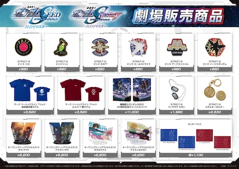 また劇場販売商品の詳細も明らかに。作中のモチーフを使用したピンズや、地球連合軍、Z.A.F.T.軍をイメージしたTシャツ、カガリのドッグタグ、オープニングのシーンを切り取ったアクリルスタンドなどがラインナップされた。販売開始日時や、取扱商品は劇場へ確認を。